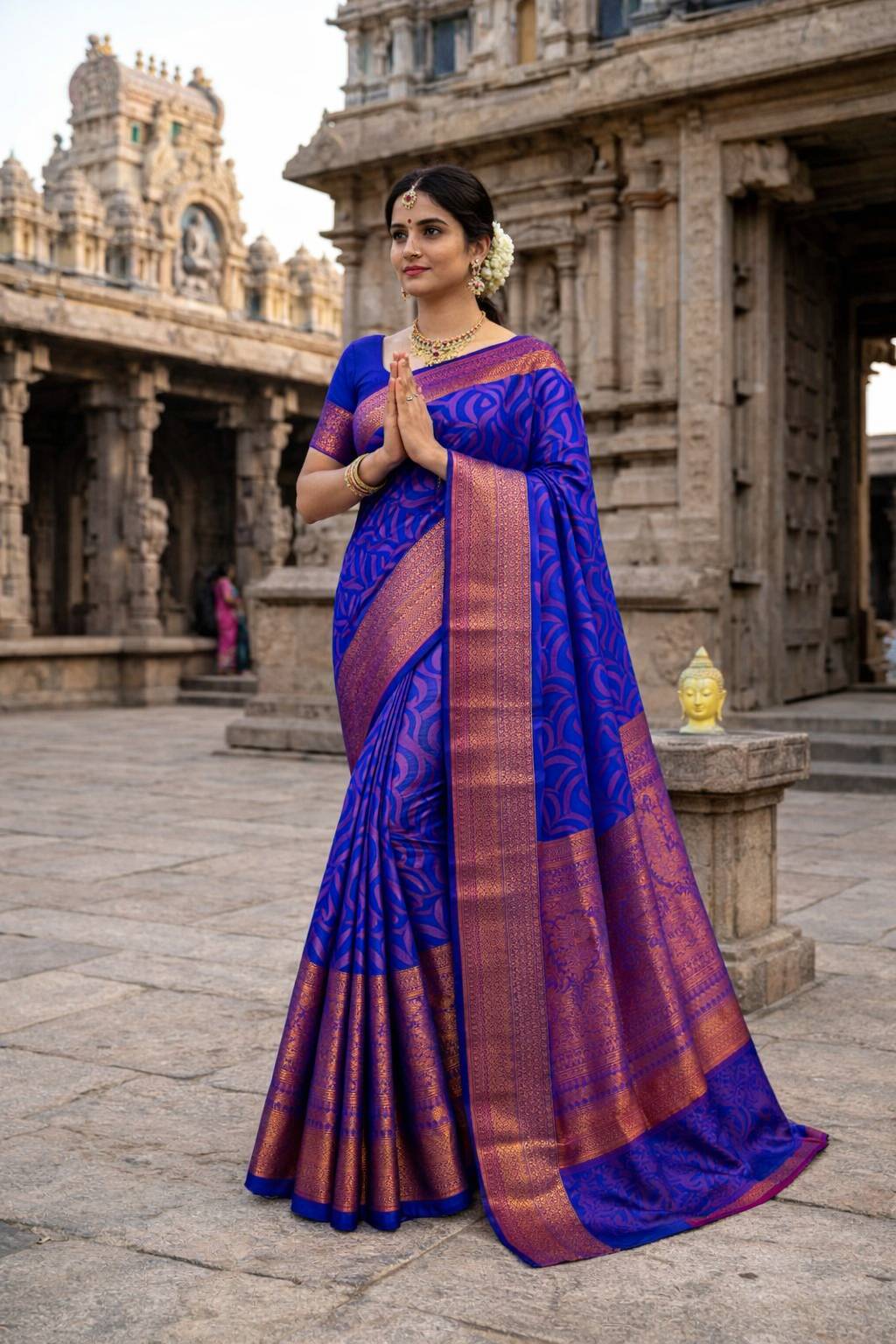 This royal blue soft silk saree is a perfect blend of tradition and elegance. Designed with intricate zari weaving, the saree showcases a beautiful patterned body that enhances its rich appearance. The grand copper zari pallu adds a luxurious touch, while the contrast purple border gives it a bold and stylish finish. Crafted from premium soft silk fabric, it offers a comfortable and graceful drape for long hours. Ideal for weddings, festive occasions, and traditional events, this saree reflects timeless beauty and cultural charm. Pair it with classic jewelry to create a stunning ethnic look effortlessly.
