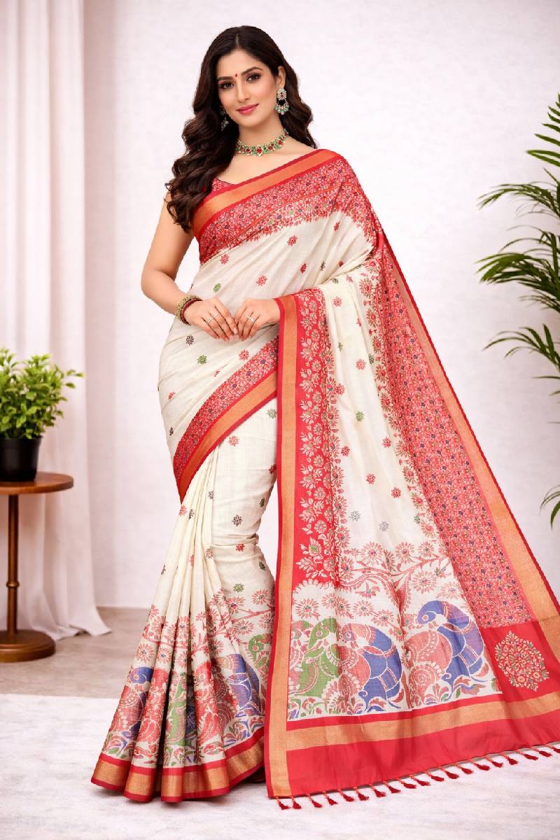 This stunning soft silk saree features a soft cream body paired with a rich red border and pallu. Designed with delicate floral motifs and beautifully detailed peacock-inspired patterns, it offers a perfect blend of tradition and vibrance. The grand woven pallu enhances its festive appeal, making it ideal for special occasions.