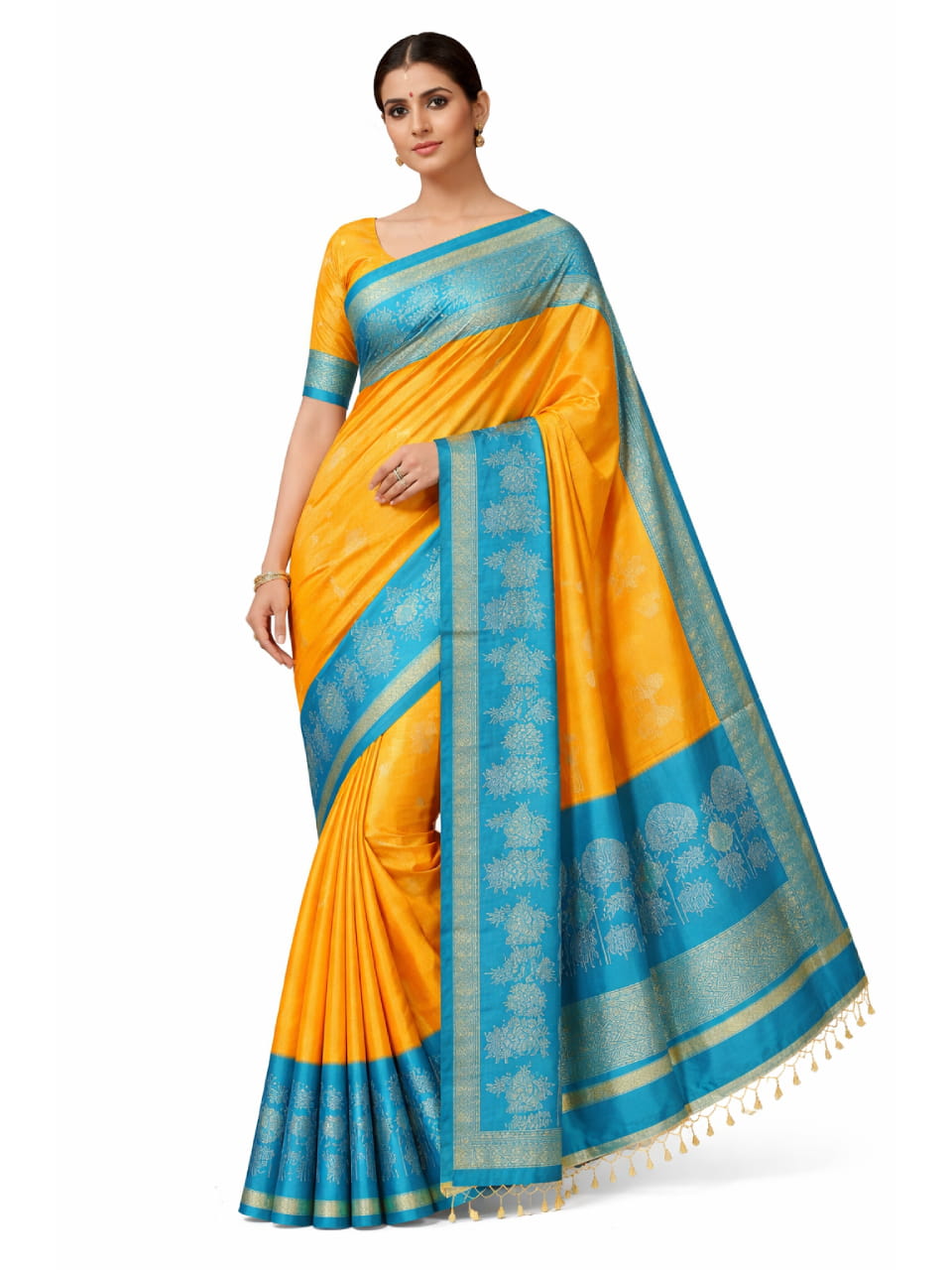 Elevate your ethnic wardrobe with Silkworms Soft Cotton Sarees in striking yellow and blue hues. Lightweight premium fabric drapes beautifully, featuring unique new colors, intricate patterns on body, elaborate blue borders, and contrast pallu design. Ideal for everyday elegance and festivities. Experience comfort and style in every wear. Ponvastra quality assured.