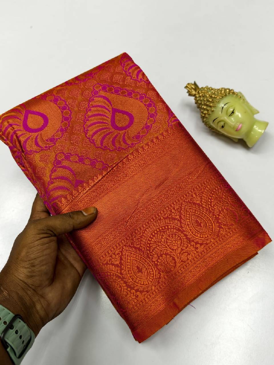 This vibrant orange silk saree is beautifully designed with detailed woven motifs that reflect traditional artistry. The subtle pink contrast enhances its charm, giving it a bright and graceful appearance. It is a perfect choice for weddings, celebrations, and cultural events.